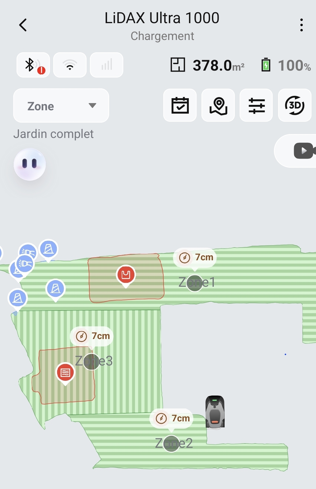 Dernière modification par WT274122 le 2026-3-16 09:50 Bonjour, je rencontre un bug dans l'application. J’ai réalisé la cartographie de mon terrain et je l’ai découpé en plusieurs zone. Le soucis est que le robot interprète les jonction entre les différentes zones comme des bordures et coupe donc à 3cm ce qui crée une démarcation avec l'intérieur de la zone qui elle est coupéà la hauteur que j’ai réglé. Le robot ne devrait pas interprété ses lignes intérieurs de jonction entre les zones comme des bordures. Pouvez vous apporter une correction ?